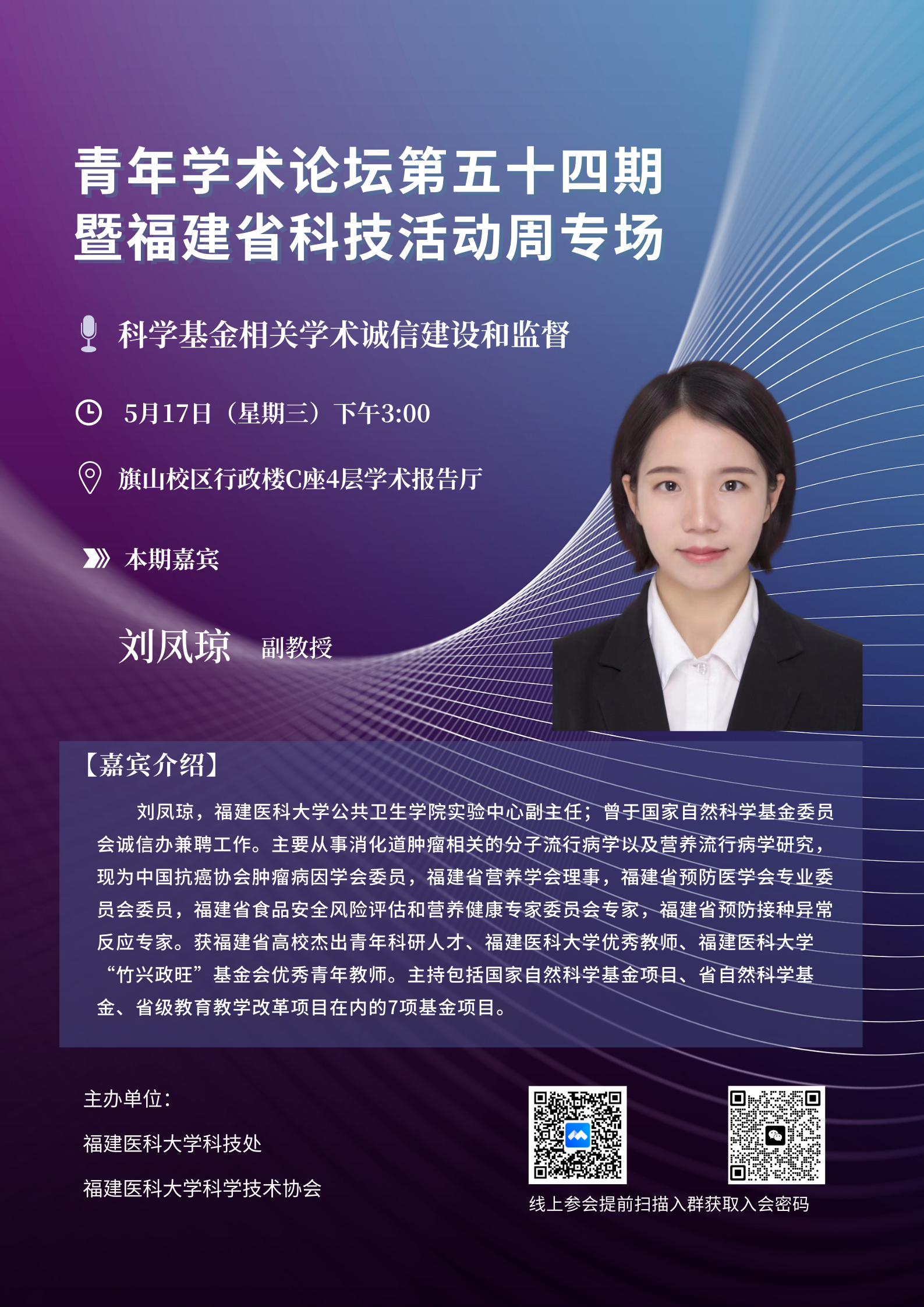 各單位科管人員及近3年入職青年科研人員需線下參會,請于5月16日下班前將參會人員名單發(fā)送至fmuzhk@fjmu.edu.cn。