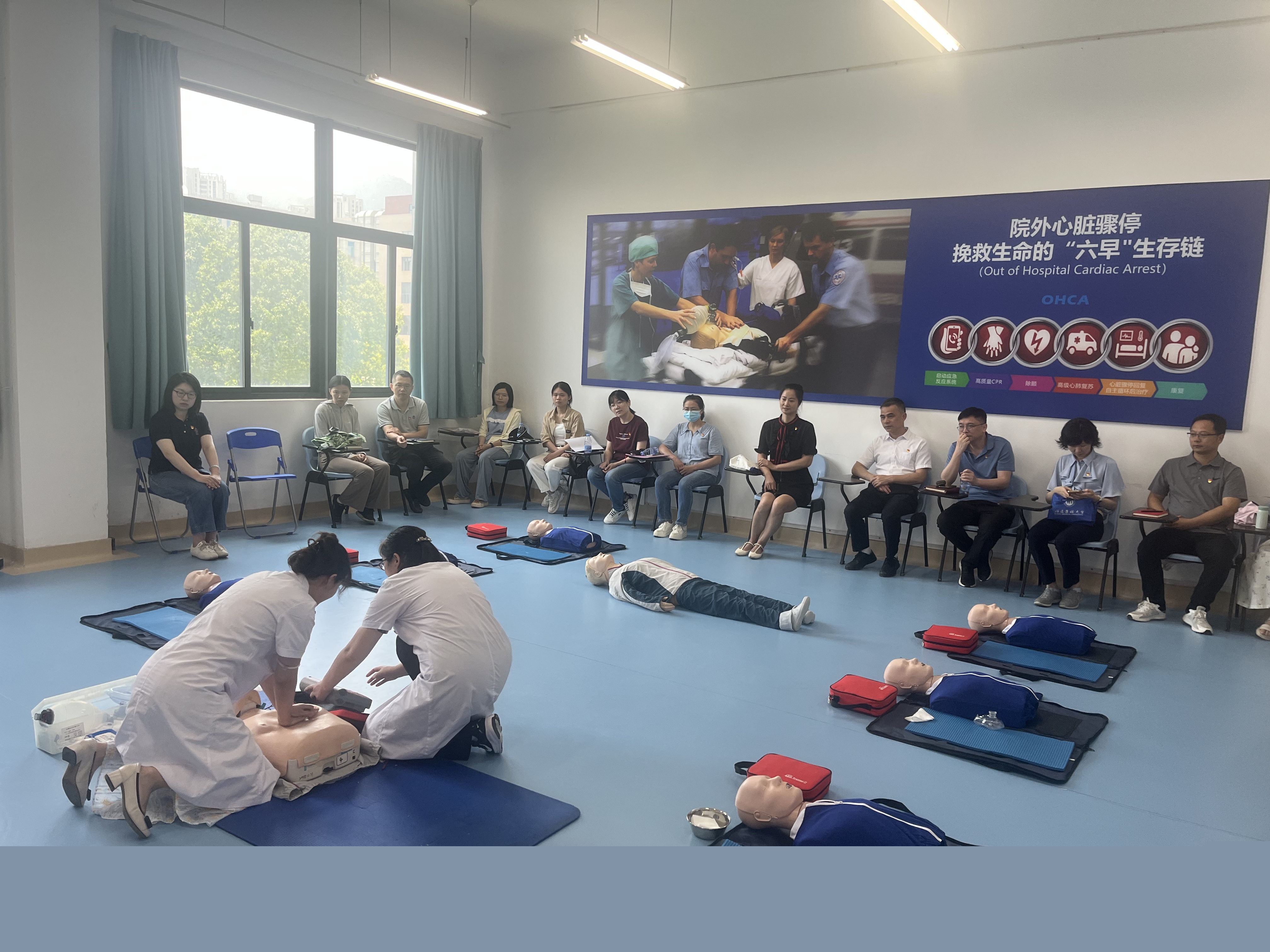 活動(dòng)最后,中心黨支部黨員代表曾愛(ài)英老師為全體黨員帶來(lái)了一場(chǎng)生動(dòng)的急救知識(shí)講座,向參加活動(dòng)的教職工黨員詳細(xì)講解了心肺復(fù)蘇術(shù)和AED的使用方法,就如何把握好心臟驟?:蟮幕平?分鐘進(jìn)行了具體教學(xué)。參加活動(dòng)的師生黨員積極利用模擬人進(jìn)行急救演練。中心黨員代表針對(duì)心肺復(fù)蘇術(shù)和AED除顫儀的使用進(jìn)行手把手教學(xué),活動(dòng)現(xiàn)場(chǎng)氣氛活躍。